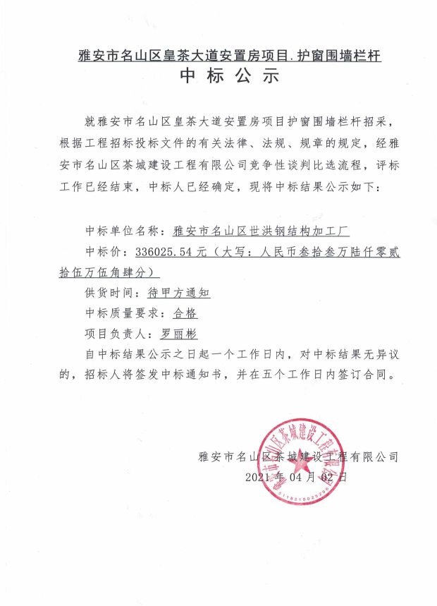 雅安市名山區皇茶大道安置房項目護窗圍墻欄桿中標公示